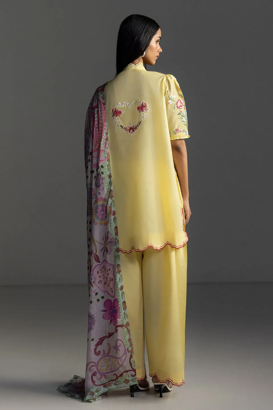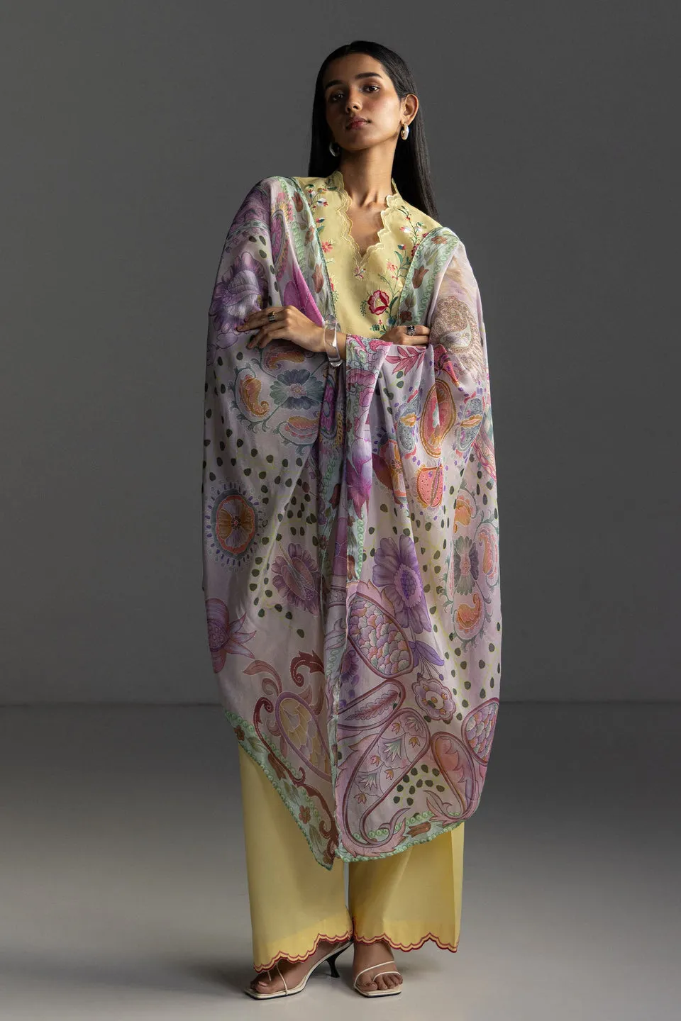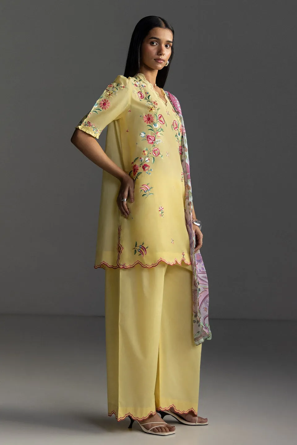 A Sunlight Yellow Shirt Adorned With Floral And Schiffli Embroidery, Paired With A Dyed Sunlight Yellow Trouser, And Finished With A Printed Multicolor Dupatta For A Cheerful And Refined Look.